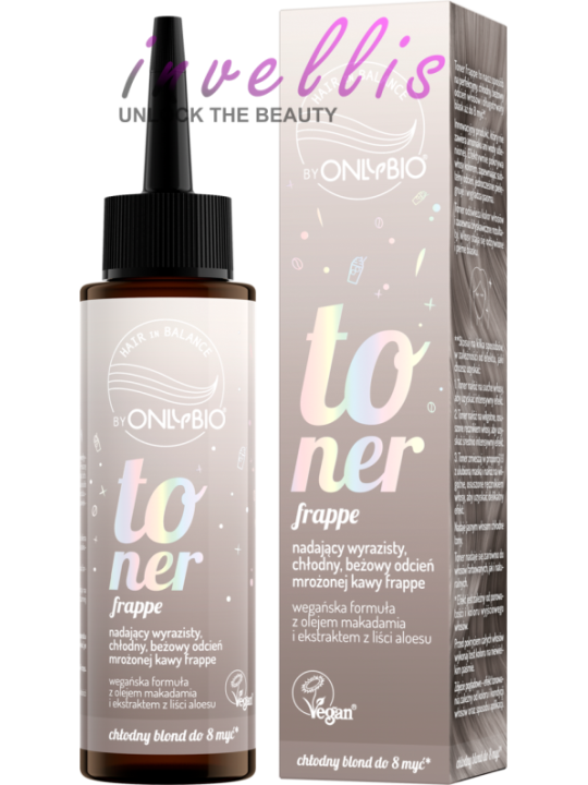 OnlyBio toner with the dessert-like scent of iced coffee frappe does not contain ammonia or hydrogen peroxide, and the cool beige shade lasts up to 8 washes.