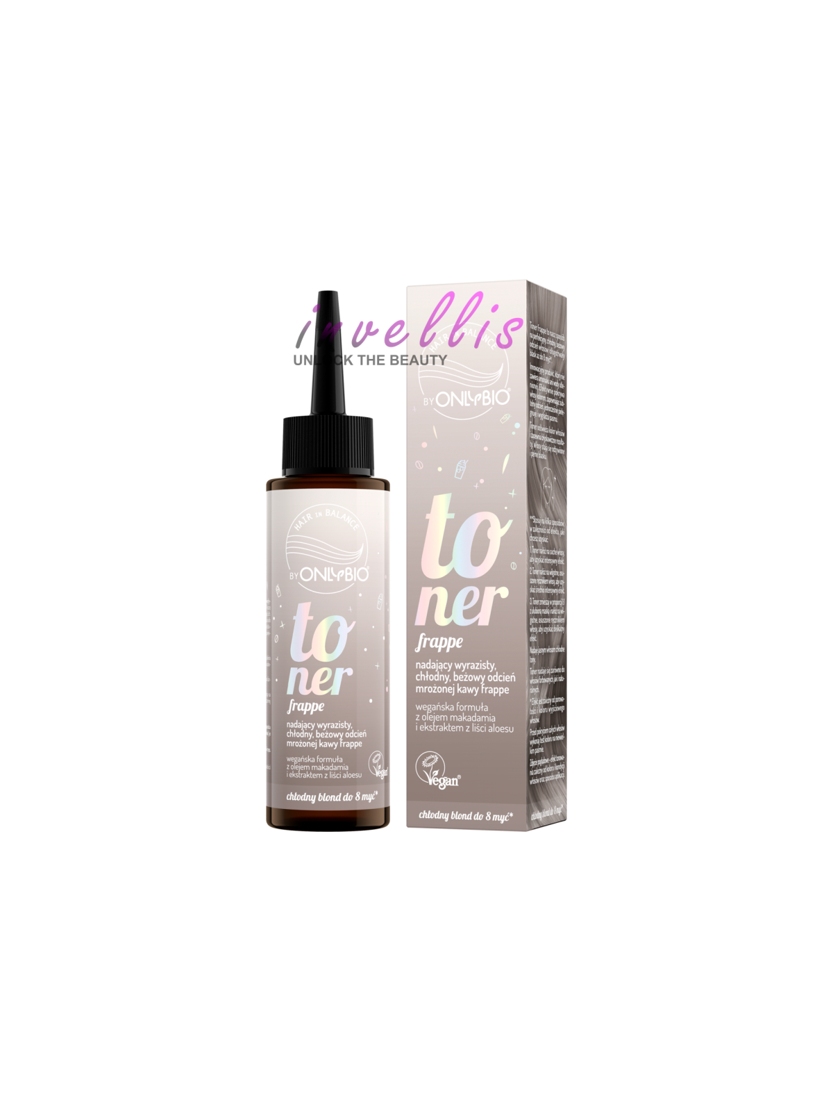 Hair toner Frappe Hair In Balance by OnlyBio refreshing the color and giving a cool beige shade of iced coffee frappe with subtle highlights.